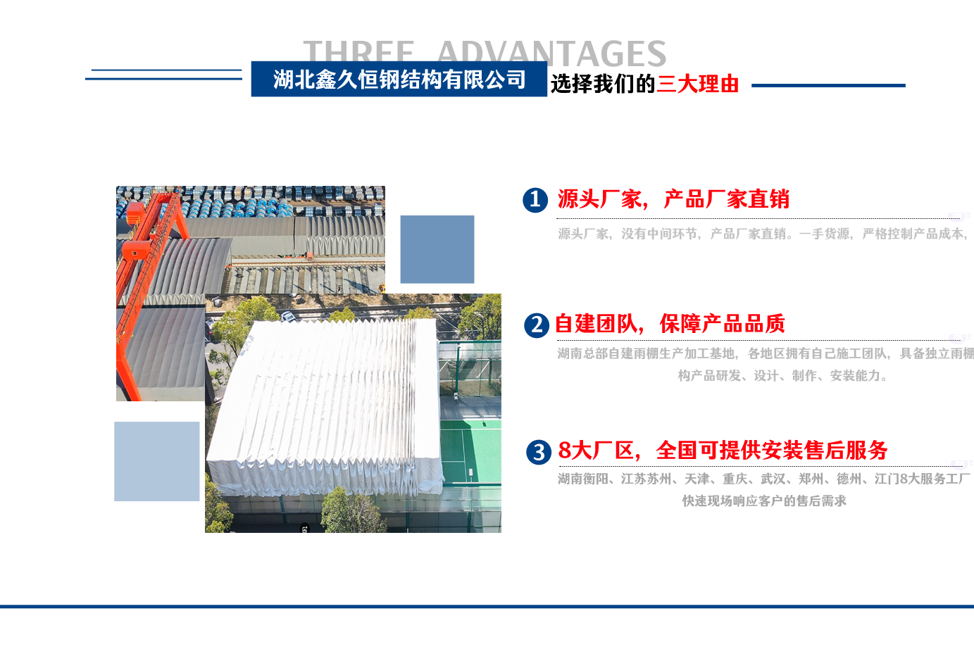 湖北鑫久恒鋼結(jié)構(gòu)有限公司是一家電動雨棚、膜結(jié)構(gòu)車棚研發(fā),生產(chǎn)銷售,施工安裝于一體的專業(yè)鋼結(jié)構(gòu)科技公司,主要產(chǎn)品有伸縮雨棚,電動雨棚,膜結(jié)構(gòu)車棚等。 湖南地區(qū)職員目前有80多人,占地面積20000平方米,廠房面積15600平方米,配備先進的生產(chǎn)流水線,使每件品質(zhì)產(chǎn)品的堅實基礎(chǔ)。 公司在蘇州、天津、重慶、武漢、德州、烏魯木齊、江門均設(shè)有服務(wù)工廠,總?cè)藛T共300多人,擁有專業(yè)的技術(shù)團隊,配備先進的設(shè)備和流水線生產(chǎn),產(chǎn)能高,貨源充足,發(fā)貨速度快,服務(wù)區(qū)域廣。 移動伸縮棚適用于通道臨時倉儲、戶外運動遮陽、污水池遮蓋、能源交通、熱力化工、礦山、船舶制造及市政建設(shè)、物流、碼頭等領(lǐng)域的構(gòu)件制作加工,成品半成品存放、倉庫、野外儀器設(shè)備操作用房等。尤其是對工廠發(fā)貨、倉儲臨時遮雨防嗮,梅雨期較長、建設(shè)周期較短的工程施工等特別適用。還可根據(jù)用戶需求量身定制、適合企業(yè)所需不同款式的產(chǎn)品。 我公司堅持“誠信社會為本,客戶滿意為榮”的經(jīng)營理念,做到質(zhì)量把控,嚴格管理,精益求精,恪守承諾。使鑫久恒逐步走向成熟,其系統(tǒng)化、專業(yè)化日趨完善。以專業(yè)的技術(shù)、科學的管理,更高的產(chǎn)品質(zhì)量,優(yōu)良的企業(yè)信譽,真誠的客戶服務(wù),靈活多樣的經(jīng)營方式和務(wù)實創(chuàng)新的企業(yè)精神愿與社會各界攜手合作,為推動智能鋼結(jié)構(gòu)建筑事業(yè)的發(fā)展而不斷努力。...